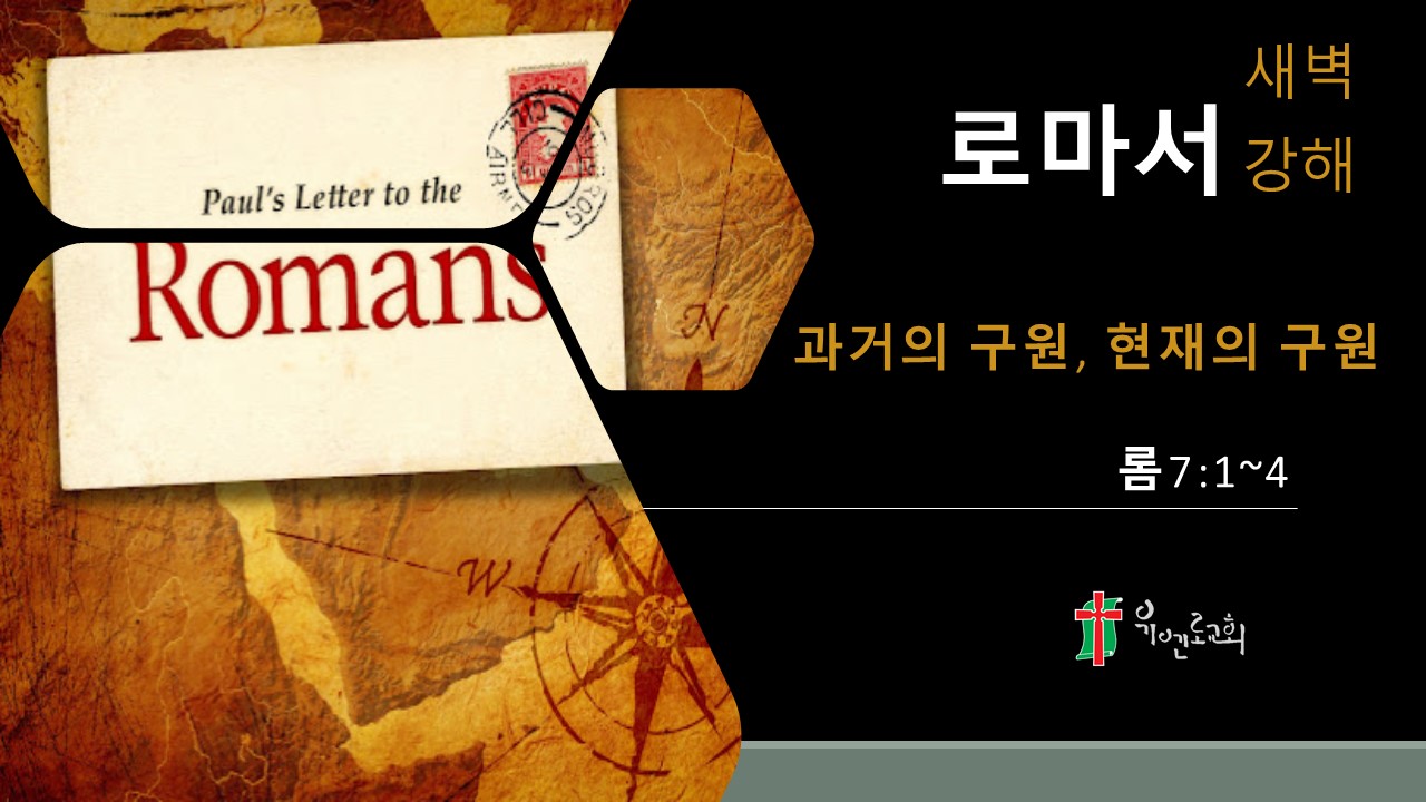 [성경본문] 로마서7:1-4절 개역개정1. 형제들아 내가 법 아는 자들에게 말하노니 너희는 그 법이 사람이 살 동안만 그를 주관하는 줄 알지 못하느냐 2. 남편 있는 여인이 그 남편 생전에는 법으로 그에게 매인 바 되나 만일 그 남편이 죽으면 남편의 법에서 벗어나느니라 3. 그러므로 만일 그 남편 생전에 다른 남자에게 가면 음녀라 그러나 만일 남편이 죽으면 그 법에서 자유롭게 되나니 다른 남자에게 갈지라도 음녀가 되지 아니하느니라 4. 그러므로 내 형제들아 너희도 그리스도의 몸으로 말미암아 율법에 대하여 죽임을 당하였으니 이는 다른 이 곧 죽은 자 가운데서 살아나신 이에게 가서 우리가 하나님을 위하여 열매를 맺게 하려 함이라