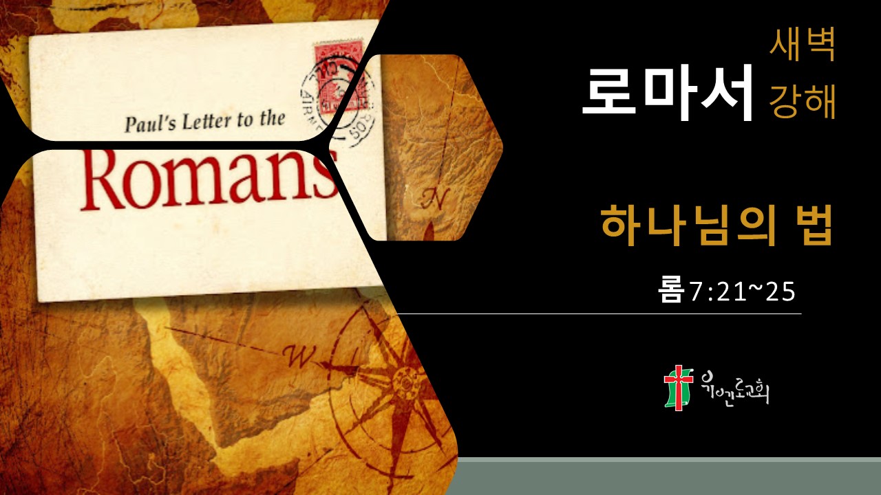 [성경본문] 로마서7:21-25절 개역개정21. 그러므로 내가 한 법을 깨달았노니 곧 선을 행하기 원하는 나에게 악이 함께 있는 것이로다 22. 내 속사람으로는 하나님의 법을 즐거워하되 23. 내 지체 속에서 한 다른 법이 내 마음의 법과 싸워 내 지체 속에 있는 죄의 법으로 나를 사로잡는 것을 보는도다 24. 오호라 나는 곤고한 사람이로다 이 사망의 몸에서 누가 나를 건져내랴 25. 우리 주 예수 그리스도로 말미암아 하나님께 감사하리로다 그런즉 내 자신이 마음으로는 하나님의 법을 육신으로는 죄의 법을 섬기노라