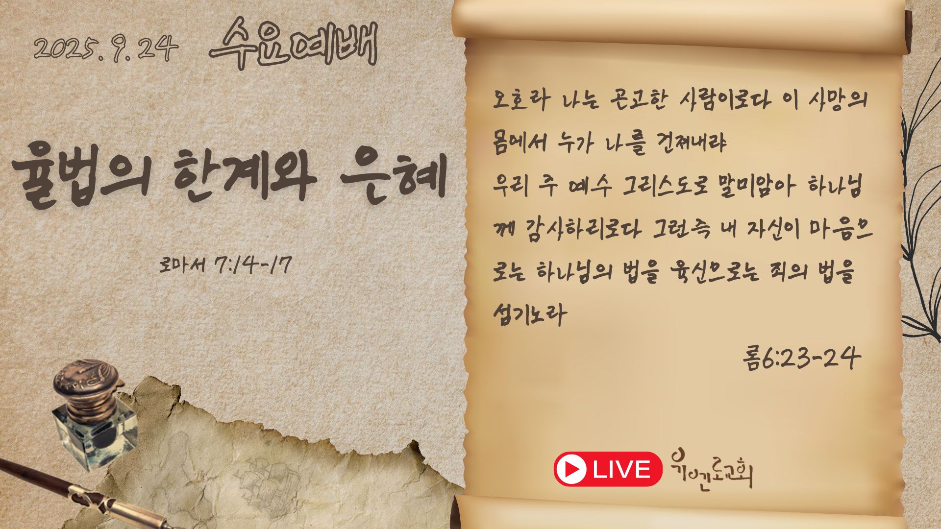 | 율법의 한계와 은혜 (로마서강해) | 유현균담임목사 | 2025-09-24 | |||
