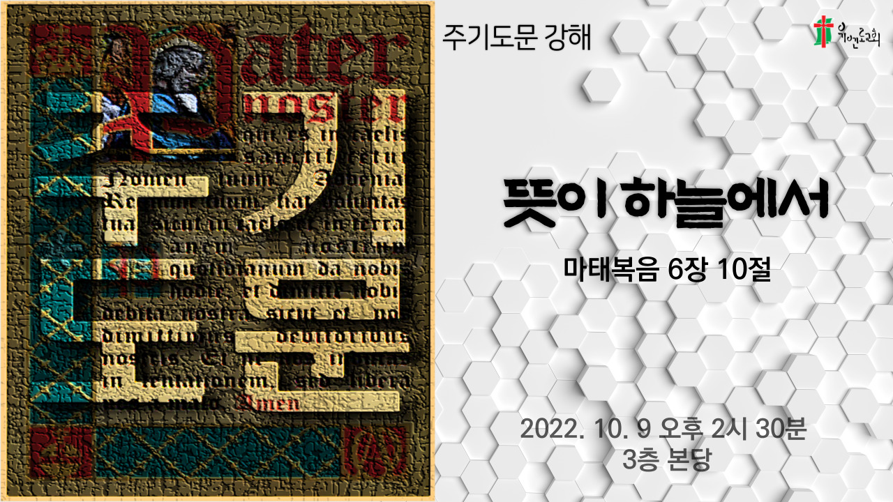 10. 나라가 임하시오며 뜻이 하늘에서 이루어진 것 같이 땅에서도 이루어지이다
