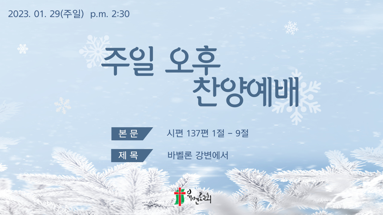 [성경본문] 시편137:1-9절 개역개정1. 우리가 바벨론의 여러 강변 거기에 앉아서 시온을 기억하며 울었도다 2. 그 중의 버드나무에 우리가 우리의 수금을 걸었나니 3. 이는 우리를 사로잡은 자가 거기서 우리에게 노래를 청하며 우리를 황폐하게 한 자가 기쁨을 청하고 자기들을 위하여 시온의 노래 중 하나를 노래하라 함이로다 4. 우리가 이방 땅에서 어찌 여호와의 노래를 부를까 5. 예루살렘아 내가 너를 잊을진대 내 오른손이 그의 재주를 잊을지로다 6. 내가 예루살렘을 기억하지 아니하거나 내가 가장 즐거워하는 것보다 더 즐거워하지 아니할진대 내 혀가 내 입천장에 붙을지로다 7. 여호와여 예루살렘이 멸망하던 날을 기억하시고 에돔 자손을 치소서 그들의 말이 헐어 버리라 헐어 버리라 그 기초까지 헐어 버리라 하였나이다 8. 멸망할 딸 바벨론아 네가 우리에게 행한 대로 네게 갚는 자가 복이 있으리로다 9. 네 어린 것들을 바위에 메어치는 자는 복이 있으리로다