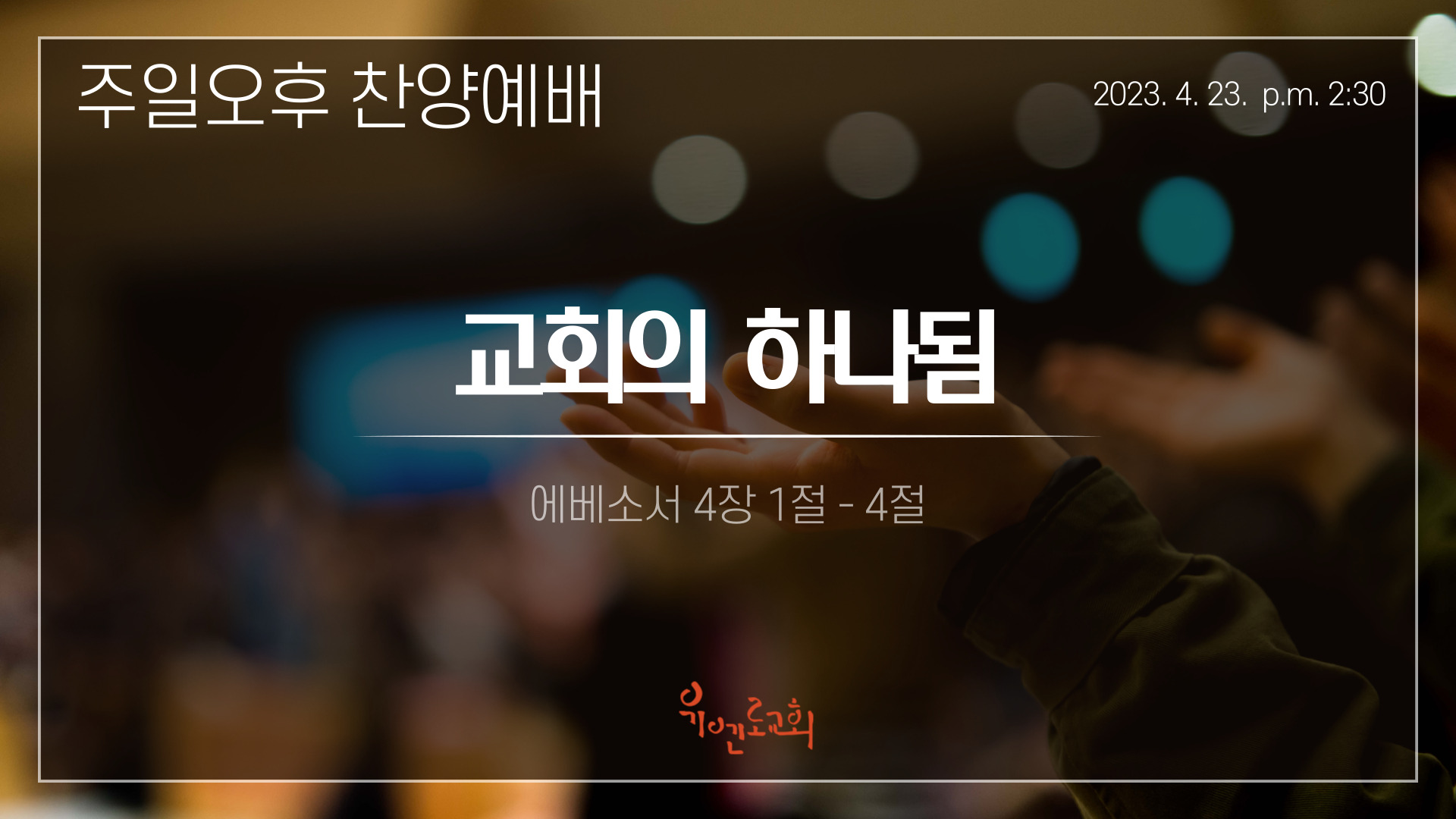 [성경본문] 에베소서4:1-4절 개역개정1. 그러므로 주 안에서 갇힌 내가 너희를 권하노니 너희가 부르심을 받은 일에 합당하게 행하여 2. 모든 겸손과 온유로 하고 오래 참음으로 사랑 가운데서 서로 용납하고 3. 평안의 매는 줄로 성령이 하나 되게 하신 것을 힘써 지키라 4. 몸이 하나요 성령도 한 분이시니 이와 같이 너희가 부르심의 한 소망 안에서 부르심을 받았느니라